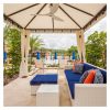 The canopy and curtains are made of heavy-duty marine-grade fabric so they can withstand rain or sunshine all year round. Offer guests privacy with perimeter curtains that are easy to close thanks to steel traversing rods and industrial zippers. This luxurious sunshade comes with a center ceiling fan mounting plate (fan not included). We offer customization such as central dividing curtains, air vents, and accents, just give our office a call for a free quote. From poolside to beachside, the Cancun Cabana is the perfect way to add value to any space!