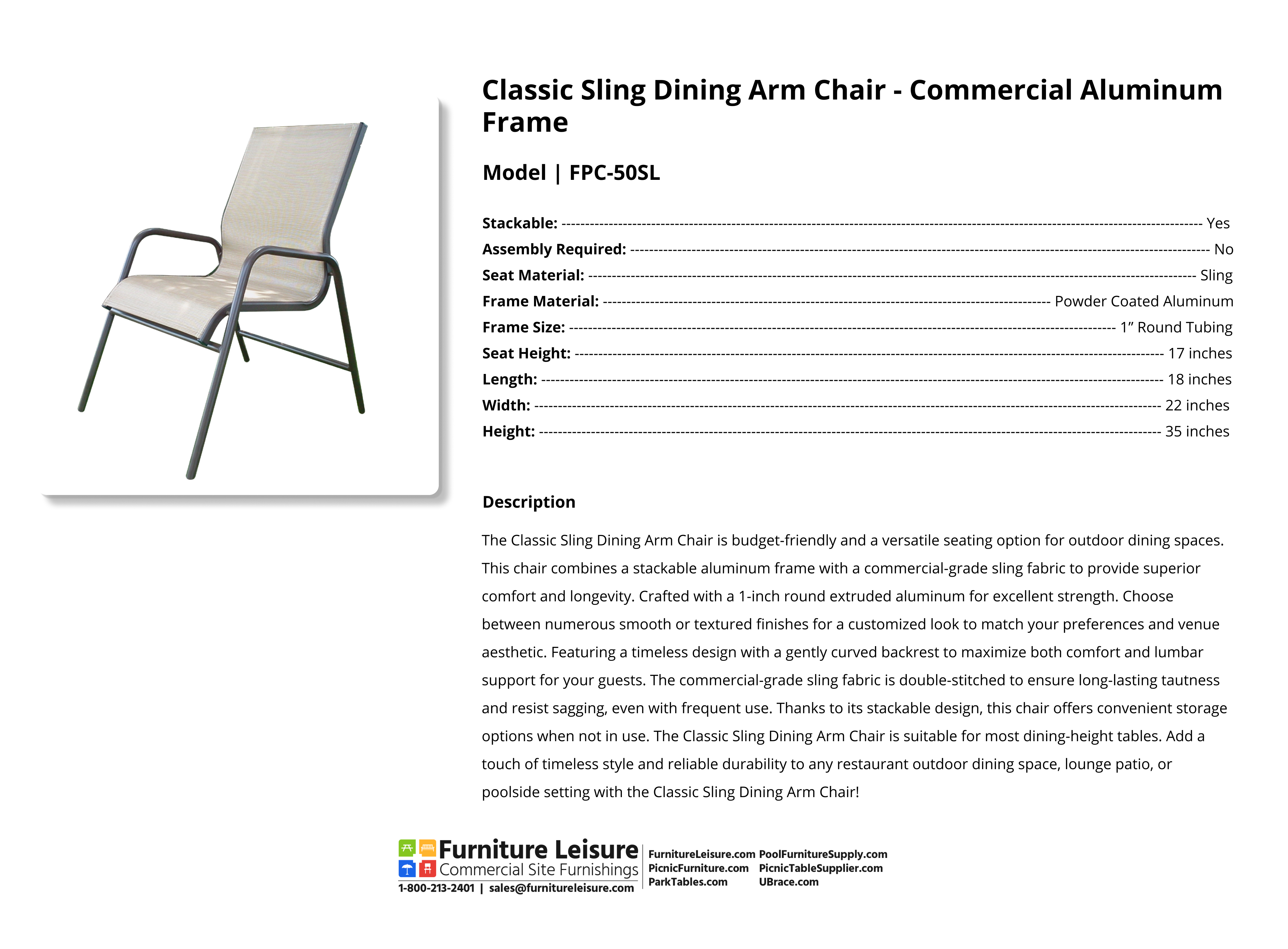 The Classic Sling Dining Chair features a convenient stackable aluminum frame and a commercial-grade sling fabric for superior comfort and durability. Constructed with a 1-inch round extruded aluminum in your choice of a smooth or textured finish. This chair features a simple but timeless design which includes a gently curved back for maximizing comfort and support. The commercial-grade sling fabric is double-stitched to retain its tautness and prevent sag. Stackable for easy storage. The seat height measures 17 inches, suitable for most dining height tables. Add timeless style to outdoor dining with the Classic Sling Dining Chair.