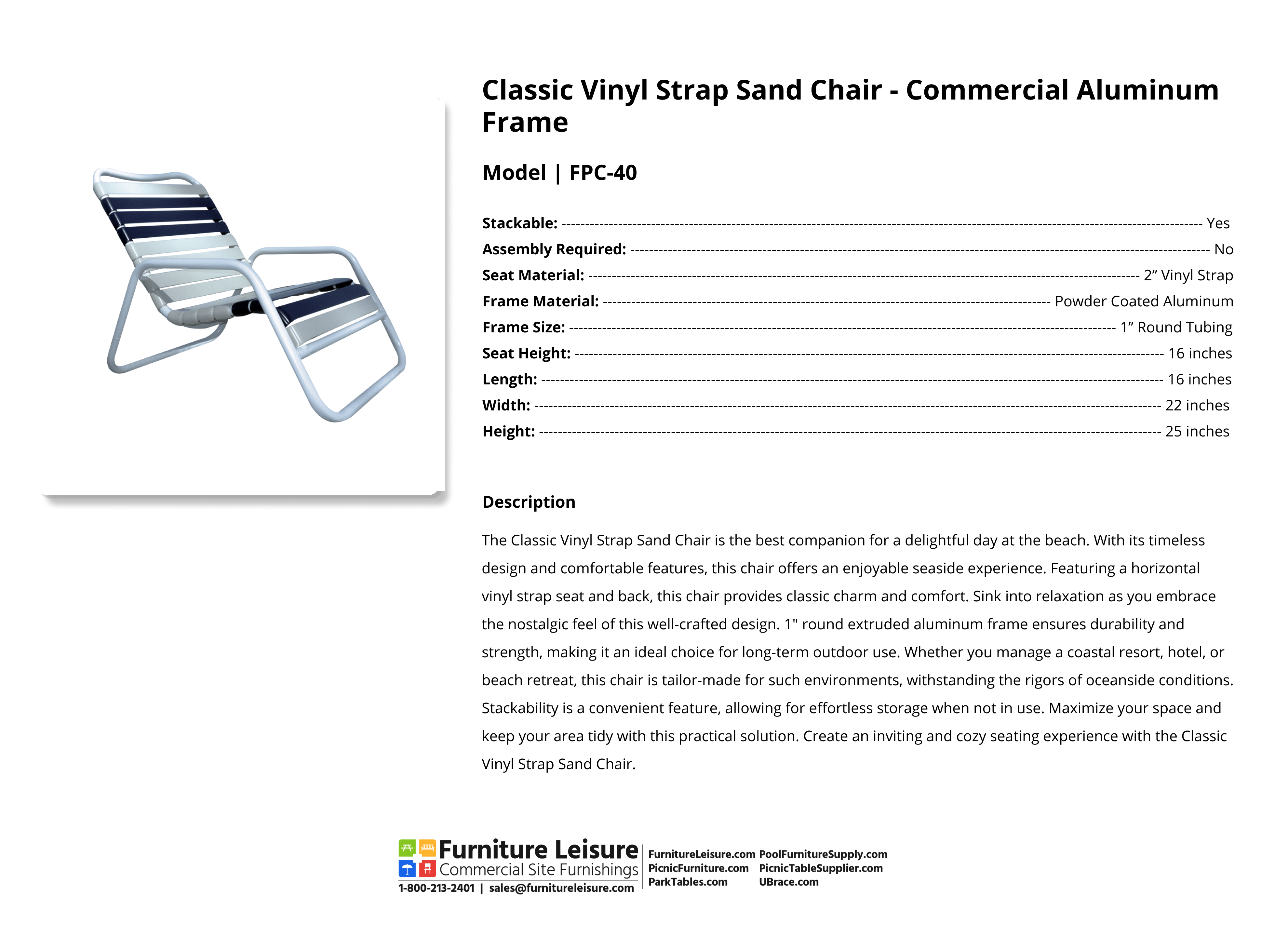 This Classic Vinyl Strap Sand Chair is the perfect way to enjoy a day at the beach. The chair features a horizontal vinyl strap seat and back, giving it a timeless yet comfortable feel. The 1" round extruded aluminum frame offers durability and strength for long-term outdoor use. Ideal for coastal resorts, hotels, and beach retreats. The chair is also stackable for easy storage when not in use. The 9" seat height is the perfect size to create comfortable and inviting seating. With its timeless style, the Classic Vinyl Strap Sand Chair is the must-have go-to for oceanside seating.