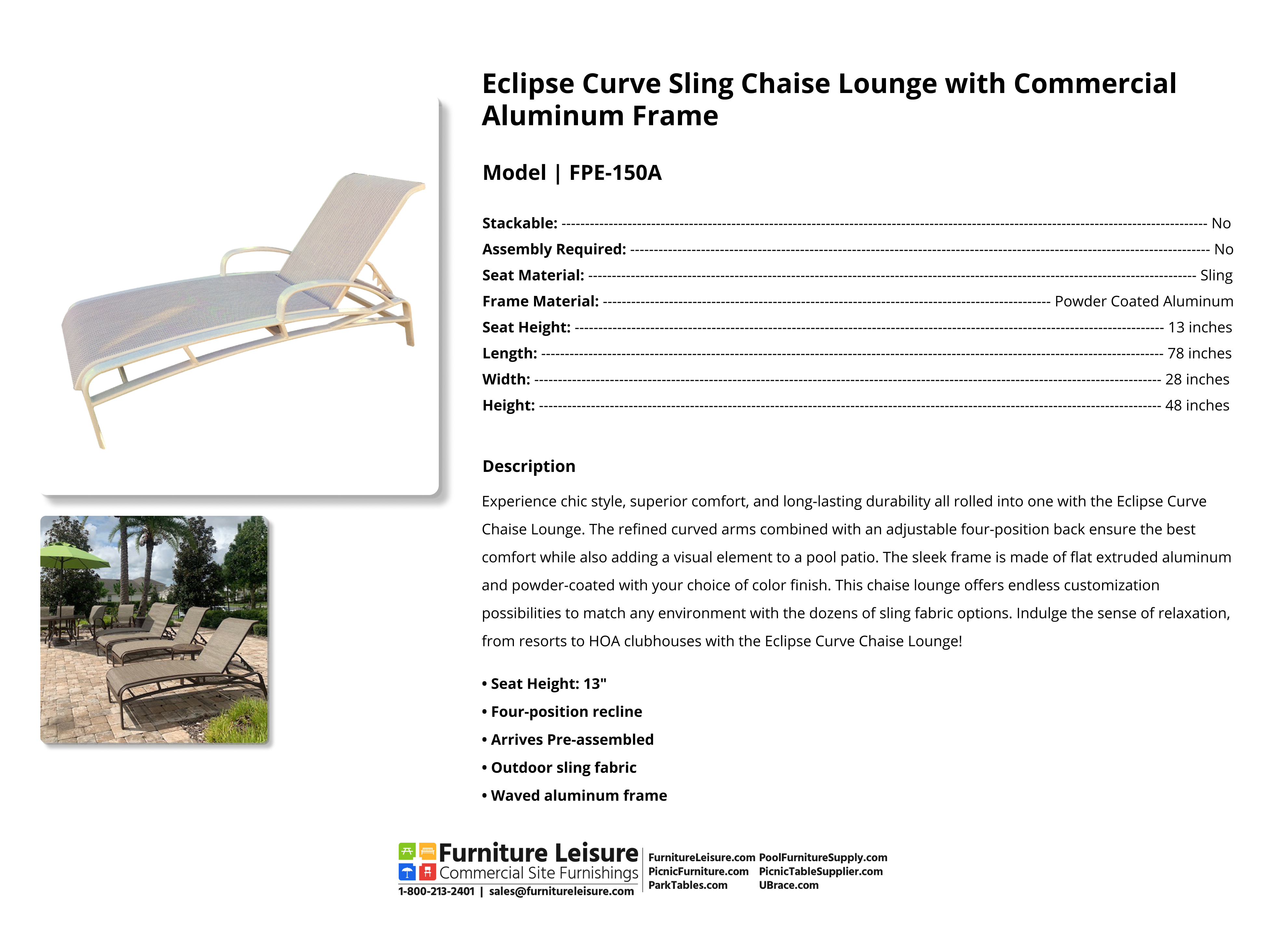 Enhance any hotel, resort, or pool clubhouse with the luxurious look of the Eclipse Curve Chaise Lounge! This sling chaise features elegantly curved arms and is built with commercial-grade aluminum for premium quality and great value. It has an adjustable four-position back so guests can decide their favorite level of comfort. The frame and sling fabric comes with a wide variety of color and finish options allowing for endless combinations. Create a style that fits both your taste and your budget with the Eclipse Curve Chaise Lounge.