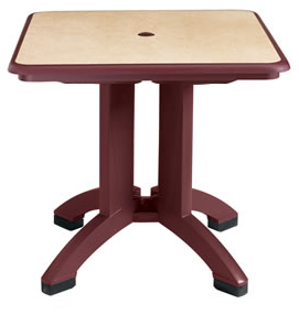 The Pietra 32 inch square dining table is a perfect outdoor table and provides enough space for 4 people to sit comfortably. Made of 100% prime resin, a material impervious to salt air, chlorine, and most common stains. Features a decorative yet durable and scratch resistant modern stone inlay design in a folding frame and large 4-prong base for stability. This table is available in Bordeaux only. Please call for higher quantity discounts. * Sold in case pack of 6