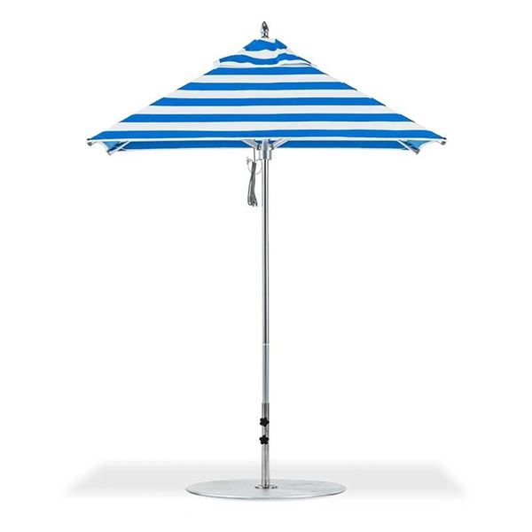 This Frankford 6.5 foot square market umbrella has an aluminum 1.5” diameter center pole and 1/8” square ribs. These high-quality umbrellas have stainless steel parts and a silver mist coating for protection against UV rays, peeling, and rotting. The pulley and pin with vent system are easy to use, making this a low-maintenance umbrella. This umbrella features 9 oz. marine-grade fabric, built to withstand heavy outdoor use and all day exposure to the sun. The square aluminum frame and triple stitched pockets are durable against weather and rough employee handling. Comes in a variety of frame and canopy colors, perfect for resorts, hotels, or a community poolside setting. Comes with 3-year commercial warranty.