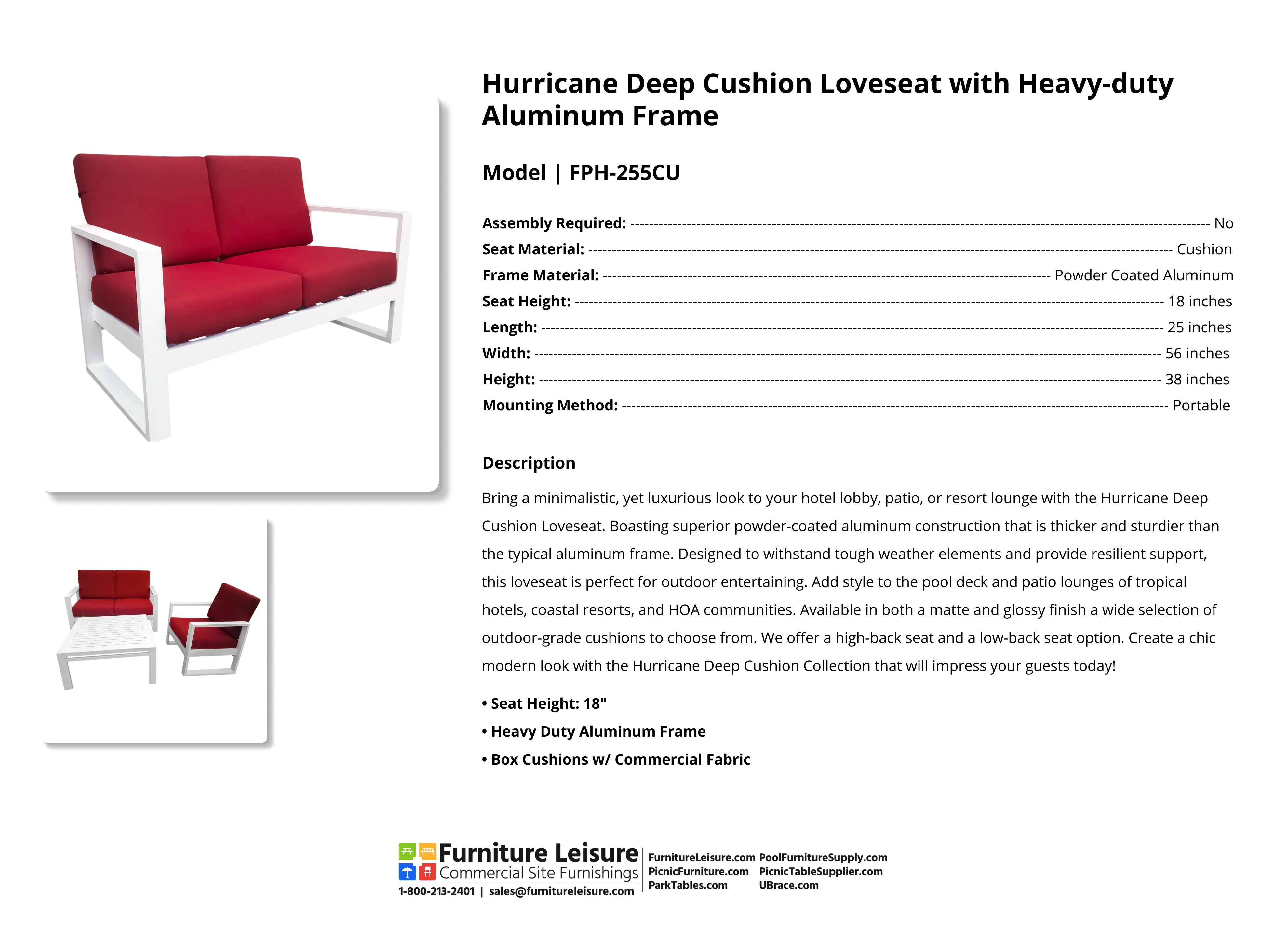The Hurricane Deep Cushion Loveseat is a perfect addition to any patio or deck lounge that gets a lot of winds. The heavy-duty aluminum frame is thicker than standard providing a stable frame that won't get tossed around in high winds. To ensure long-lasting durability the frame is sandblasted before powder-coating. It is perfect for both indoor and outdoor use and comes in a wide range of finishes. Pick from our wide selection of fabrics. Perfect for creating warm and inviting seating spaces, the Hurricane Deep Cushion Loveseat is the top choice for patios, lobbies, and lounge decks everywhere.