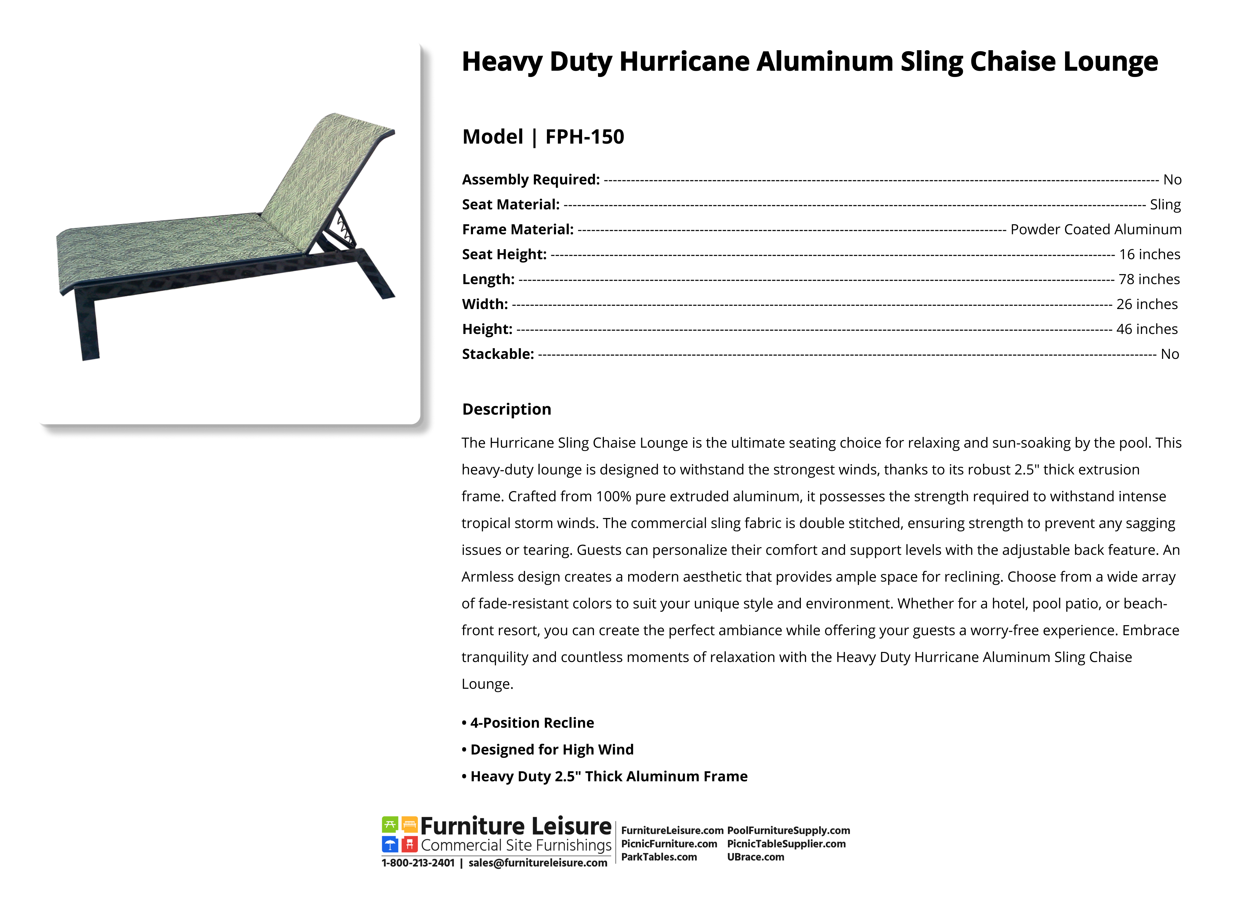 The Hurricane Armless Sling Chaise Lounge is the perfect seating option to relax and soak up the sun. Its heavy-duty thick extrusion frame ensures it will not be pushed around in high winds. Constructed with a 2.5" 100% pure extruded aluminum ensuring the strength to handle even tropical storm winds. The armless design gives this chaise lounge a contemporary design, allowing for more room when reclining. The adjustable back allows guests to customize their comfort and support. The commercial sling fabric is double stitched for strength and sag prevention to ensure the chaise lounge will be enjoyed for years to come. Choose from a wide selection of fade-resistant colors to best suit your hotel, patio, or beach-front resort. Give yourself and your guests' peace of mind with the Heavy Duty Hurricane armless sling chaise lounge and enjoy worry-free moments for years.
