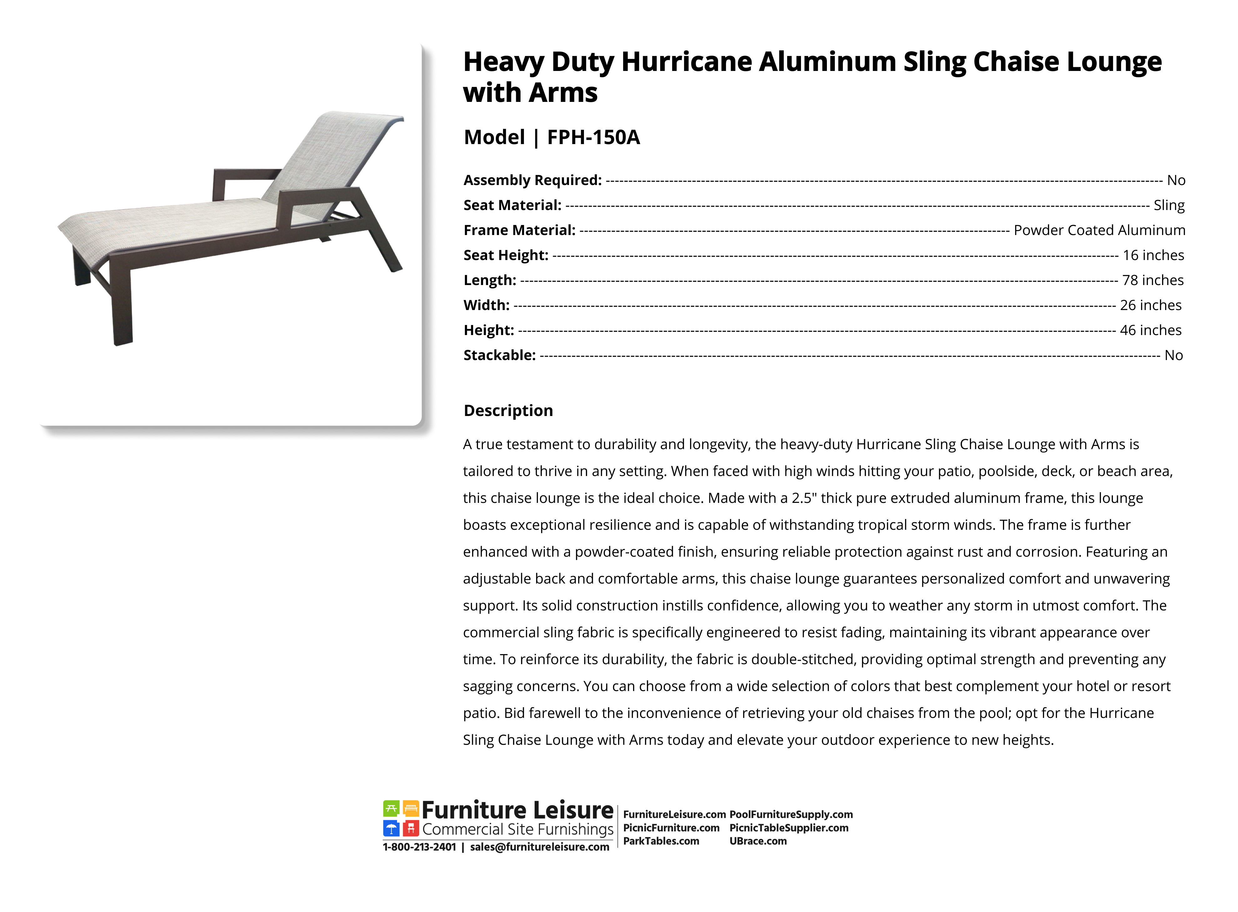 The heavy duty Hurricane Sling Chaise Lounge is designed to last in any environment and is perfect for a patio, pool, deck, or beach where high winds are common. The frame is made from 2.5″ thick pure extruded aluminum, this thicker extrusion is durable enough to handle tropical storm winds! It is powder-coated for rust and corrosion resistance and designed for both indoor and outdoor use. With its adjustable back, comfortable arms, and solid construction, this chaise lounge will get you through any storm comfortably. Made with fade-resistant commercial sling fabric that is double stitched to ensure the best strength and sag prevention. Pick from a wide selection of colors to best suit your hotel or resort patio. Don't be left fishing your old chaises from the pool, get the Hurricane Sling Chaise Lounge today!