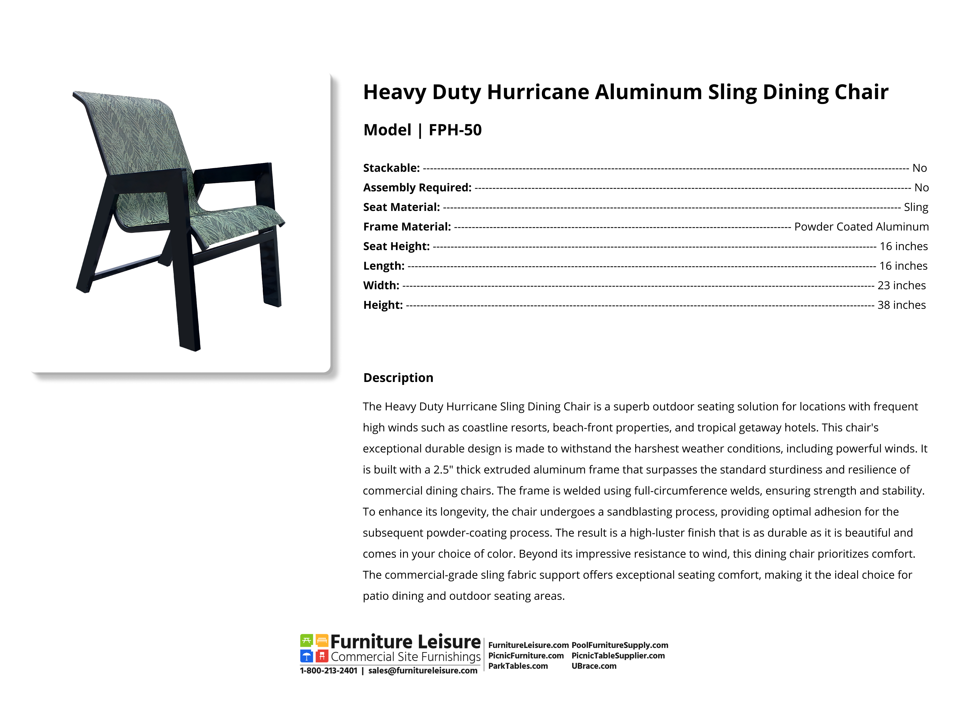 The Heavy Duty Hurricane Sling Dining Chair is a great outdoor seating chair specifically designed to remain unscathed from harsh weather such as high winds. Its frame is made from 2.5″ thick extruded aluminum and is welded with full-circumference welds, making it far sturdier than standard chairs. It is sandblasted to provide the best adhesion for the powder-coating process to ensure a perfect, high luster durable finish result. Not only is it wind-resistant, but it is also comfortable with commercial-grade sling fabric support, making it the perfect choice for patio dining and outdoor seating. Pick from a wide variety of fabrics and frame finishes to create a dining chair as unique as your venue. Add value to a hotel patio, resort deck, or beach-front dining space with the Heavy Duty Hurricane Sling Dining Chair.