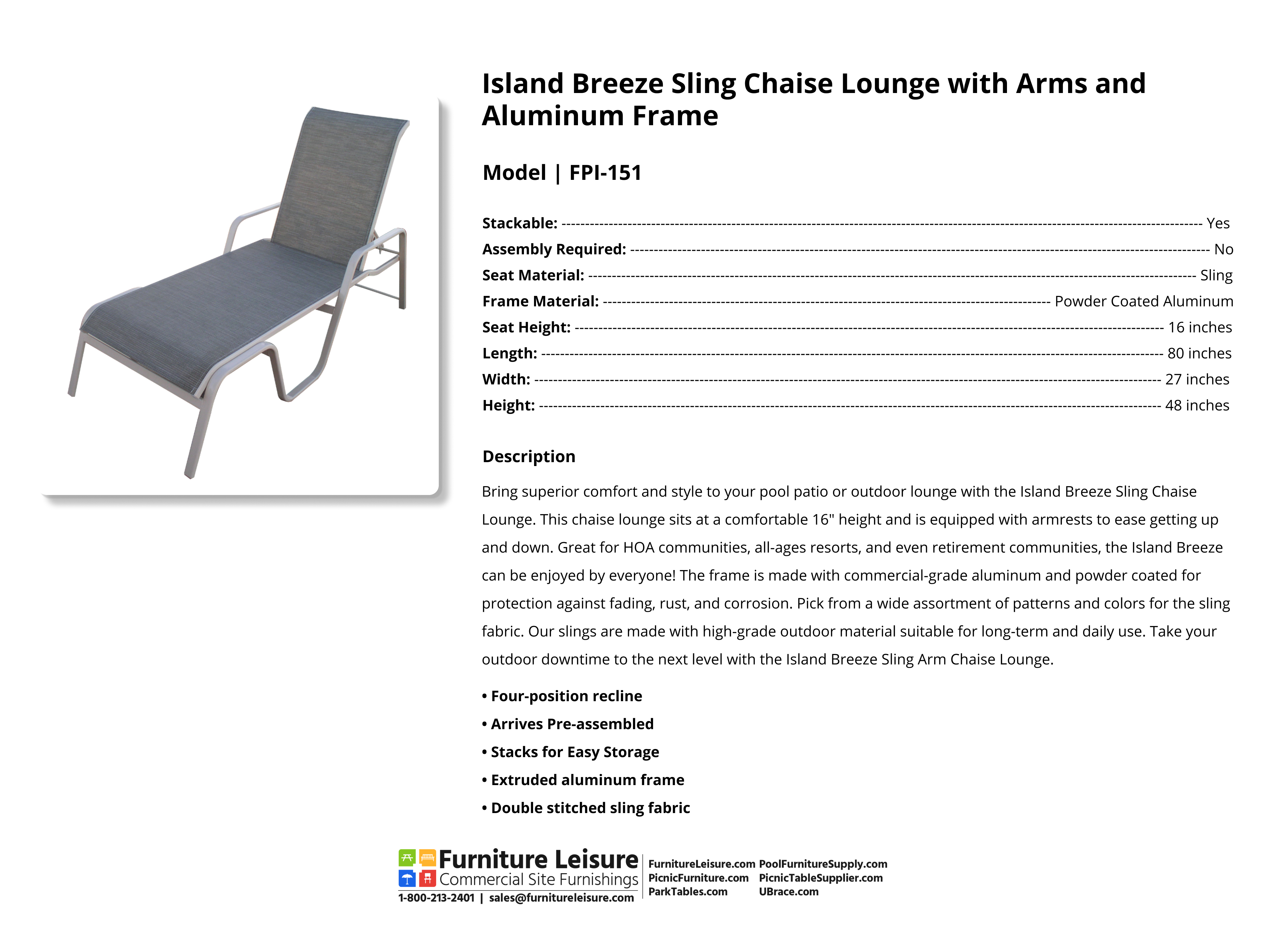 Add a touch of luxury without breaking the bank with the Island Breeze Sling Arm Chaise Lounge. This simple yet stylish chaise lounge is designed for comfort and perfect for patio poolside lounging. With a 16" seat height and fully welded armrests, this chaise is senior-friendly and ideal for hotels, resorts, and HOA communities. Constructed with heavy-duty, double-stitched sling fabric and an extruded aluminum frame. Pair with any outdoor space thanks to the wide variety of color options. With the Island Breeze Sling Arm Chaise Lounge, everyone can enjoy relaxing by the pool.