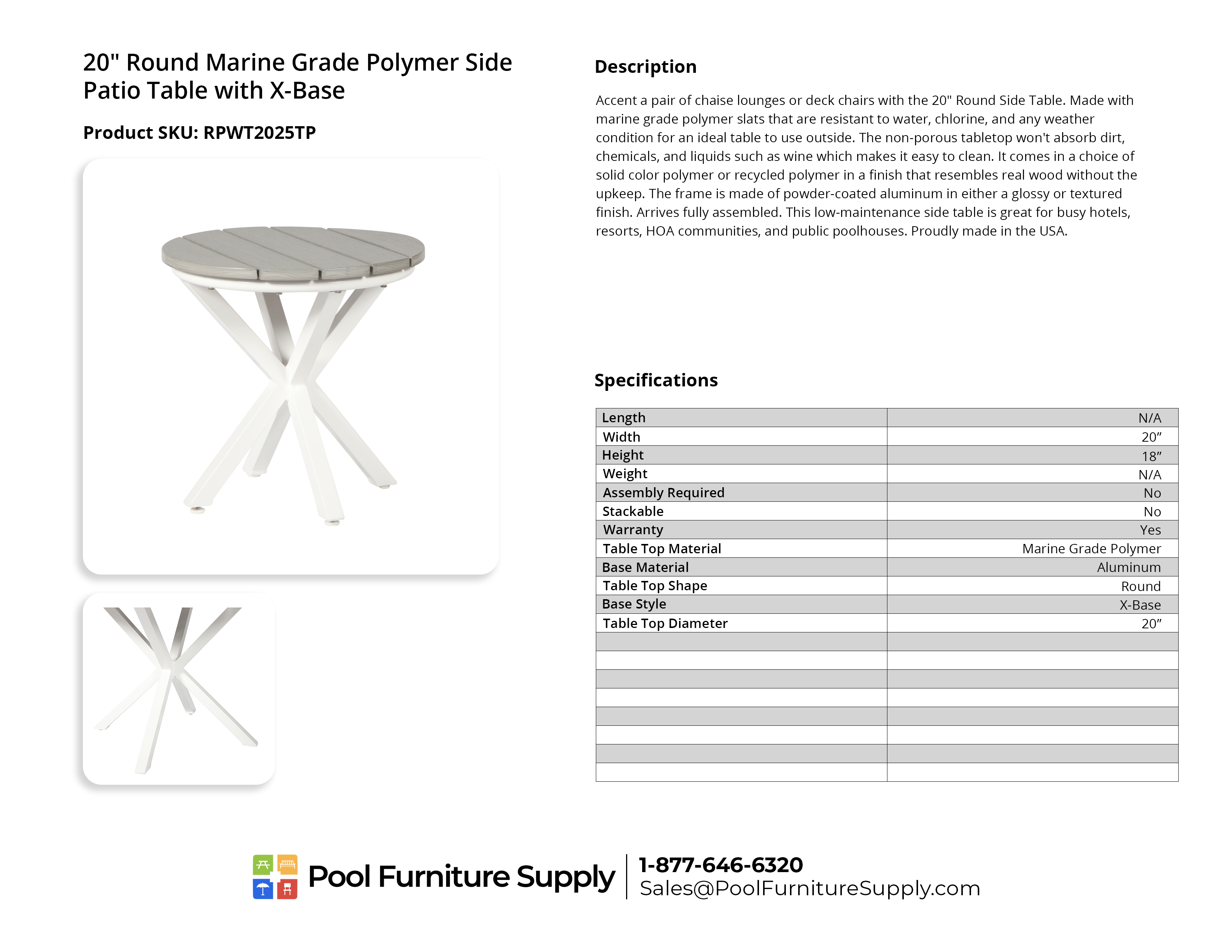 The Tahoe Plank Side Table offers a stylish place to put food and drinks. Marine-grade polymer planks in solid or woodgrain make up the tabletop, MGP is non-porous so it doesn't absorb dirt and liquids providing carefree cleanup. Marine-grade polymer is a high-density polyethylene that is resistant to corrosion, mildew, and salty air so pair with chaise lounges by the pool or with deck chairs on the marina. The frame is a commercial aluminum that is powder-coated to resist rust, scratch, and fade. The Tahoe Plank Side Table is a great compliment to any patio or lounge set.